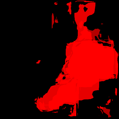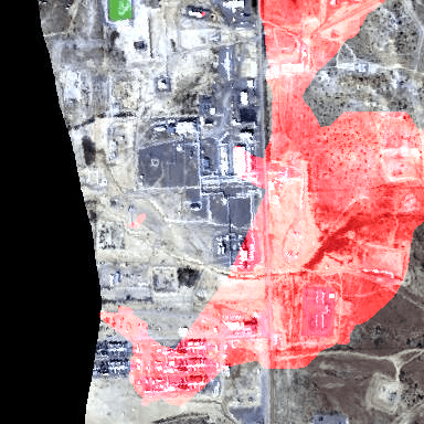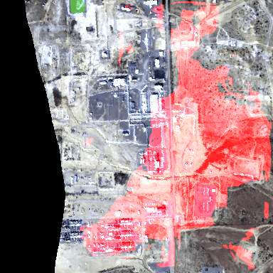 Figure. From left to right. Overhead view of hyperspectral data with methane plumes as red masks (top row) overlayed on the observed terrain (bottom row). The columns are ground-truth (first column), naive single-band prediction (center column), and H-mrcnn ensemble prediction (right column). The core detector is the mask-rcnn detector with ResNet-101 as backbone.
